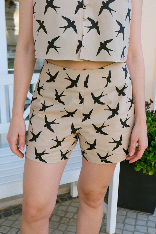 IZZY High-Waisted Shorts – Beige with Hand-Painted Swallow Print | Limited Edition | Size M
